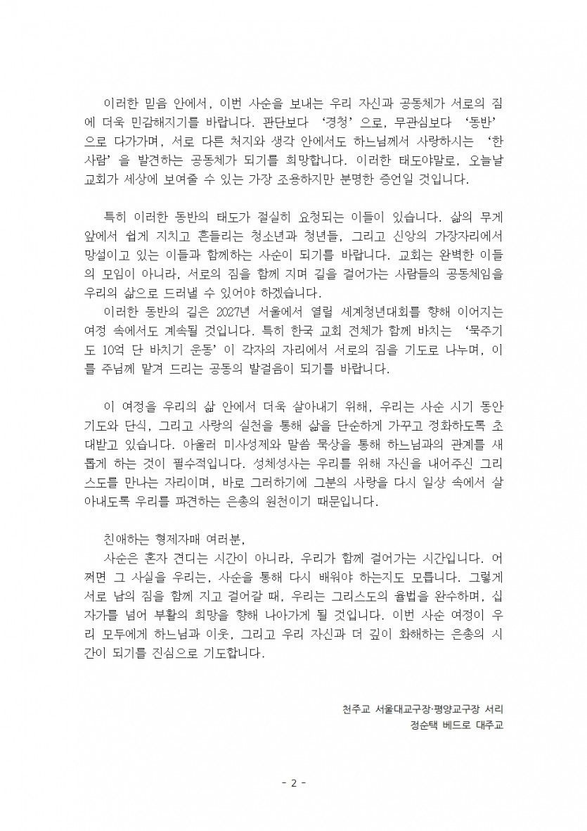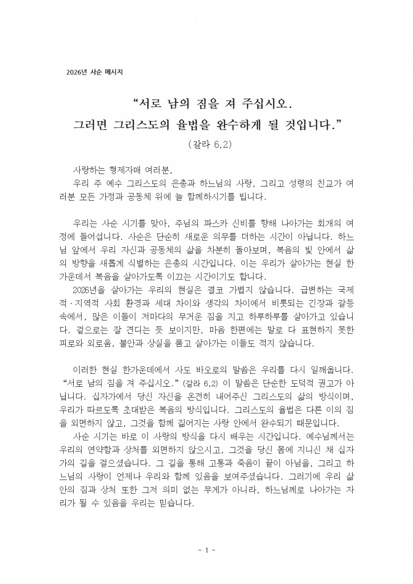 2026년 교구장님 사순 메시지 페이지 정보 작성자 쌍문동성당 댓글 댓글 0건 조회Hit 109회 작성일Date 26-02-14 09:20 본문 찬미예수님, 2026년 교구장님 사순 메시지 입니다. 목록 다음글2025년 교구장님 성탄메시지 25.12.16 댓글 0 댓글목록 등록된 댓글이 없습니다.
